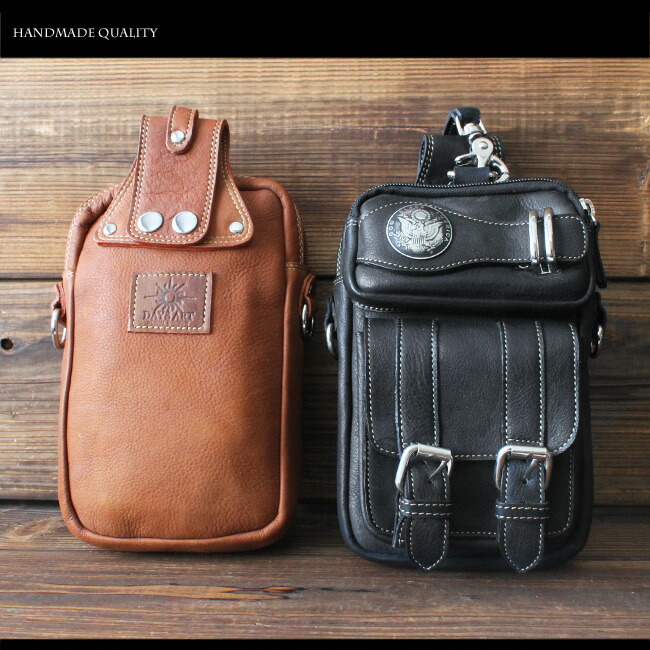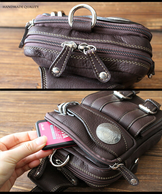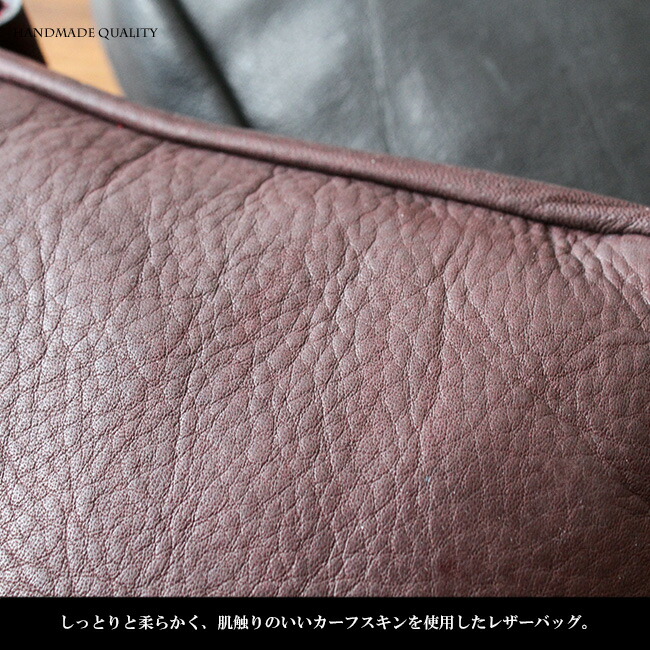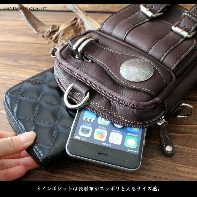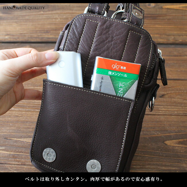 キメが細かくとても柔らかくて肌触りのいい上質のカーフスキン(子牛の革)を使用し、革職人がハンドメイドで製作しています。長財布、スマホをしっかり収納できるサイズのメインポケットと前面には2つのサブポケットがあり、ベルトがオシャレなデザインになっています。ベルトループはボタン式で着脱がし易く、ストッパーが付いているのでもしもの時のも安心です。本革ですので使い込むほどに革がなじみ、風合いが増していきます。