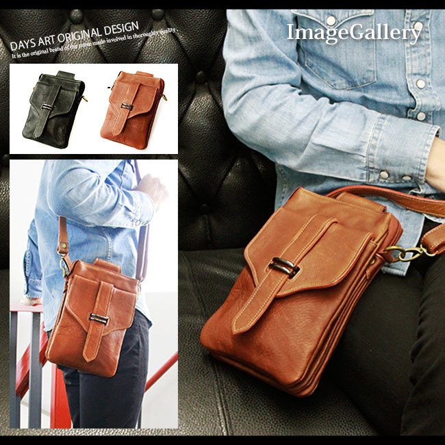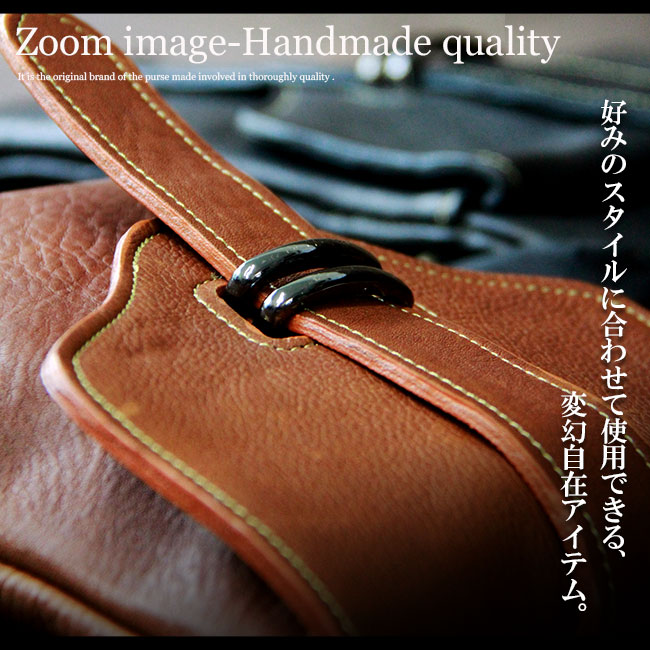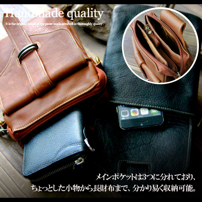 キメが細かく柔らかいカーフスキンを使用して革職人がハンドメイドで製作しています。メインポケットは内部で3つに分かれており、全面ポケットと併せて4つのポケットで使い分けができるようになっています。ショルダーベルトで肩掛けとして持ち運びができ、取り外すことでベルトループを使用して腰回りに着用することも可能です。センターベルトがスマートなデザインを演出します。