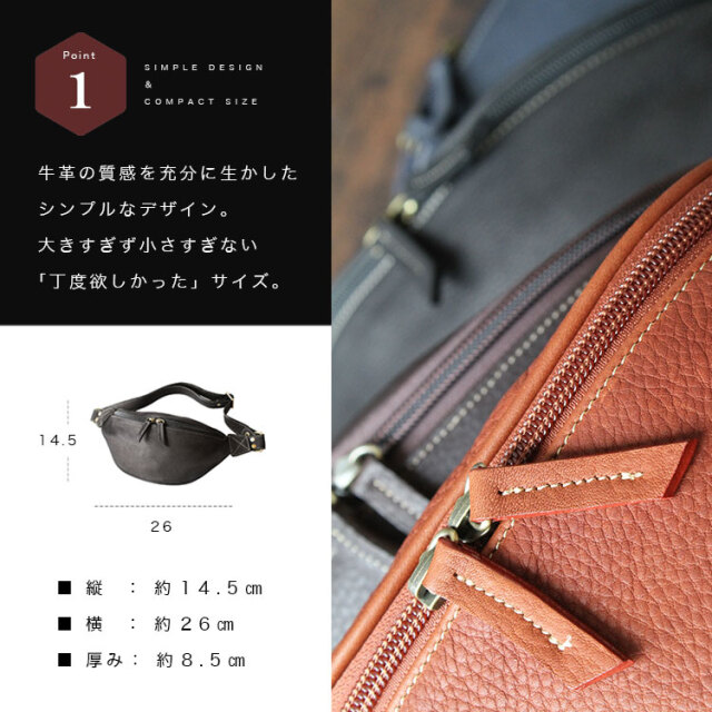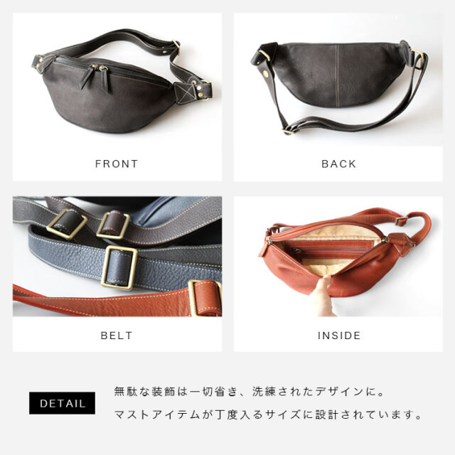キメが細かくとても柔らかくて肌触りのいい上質のカーフスキン(子牛の革)を使用し、革職人がハンドメイドで製作しています。メインポケットと内部ファスナーポケットのシンプルなデザインがオーソドックスで使い易いバッグです。内部は起毛タイプの生地で手触りもよく、収納物を傷つけません。