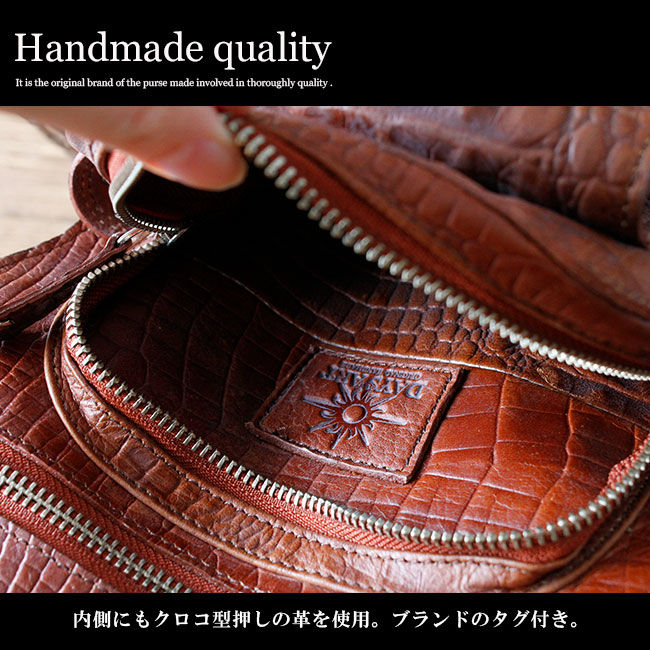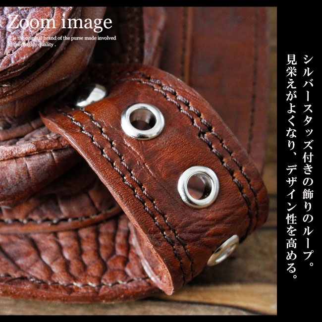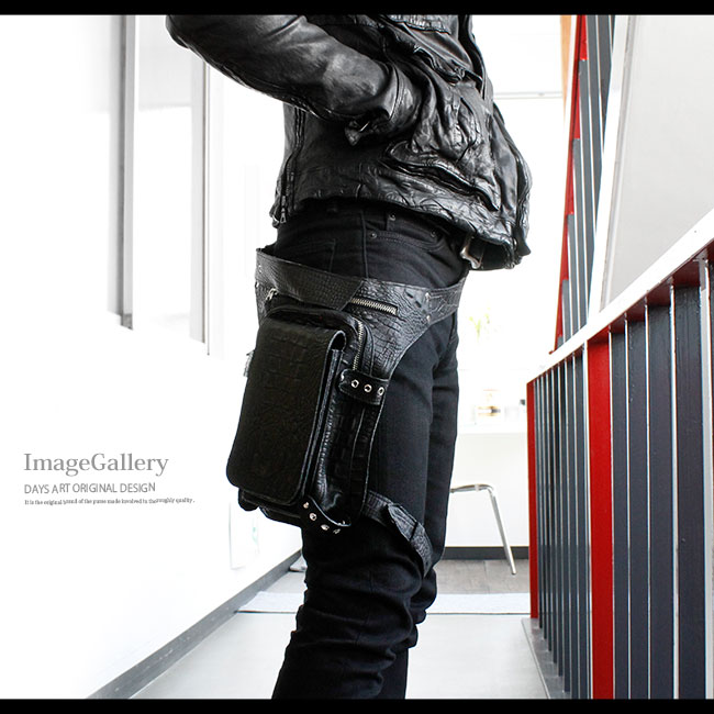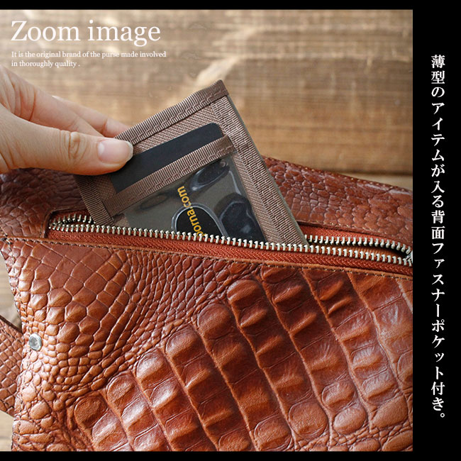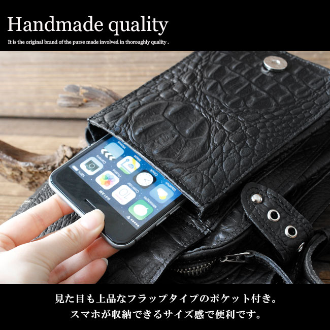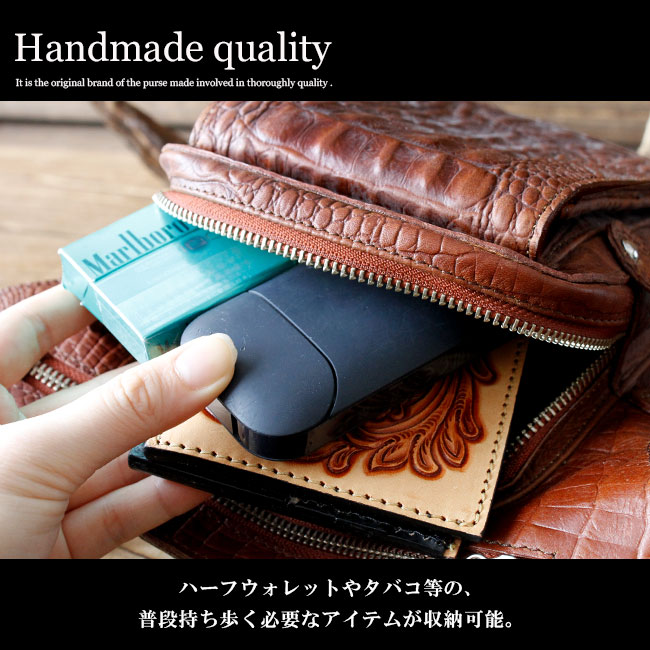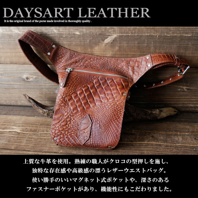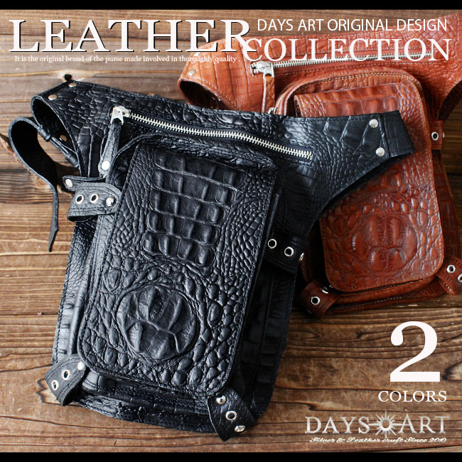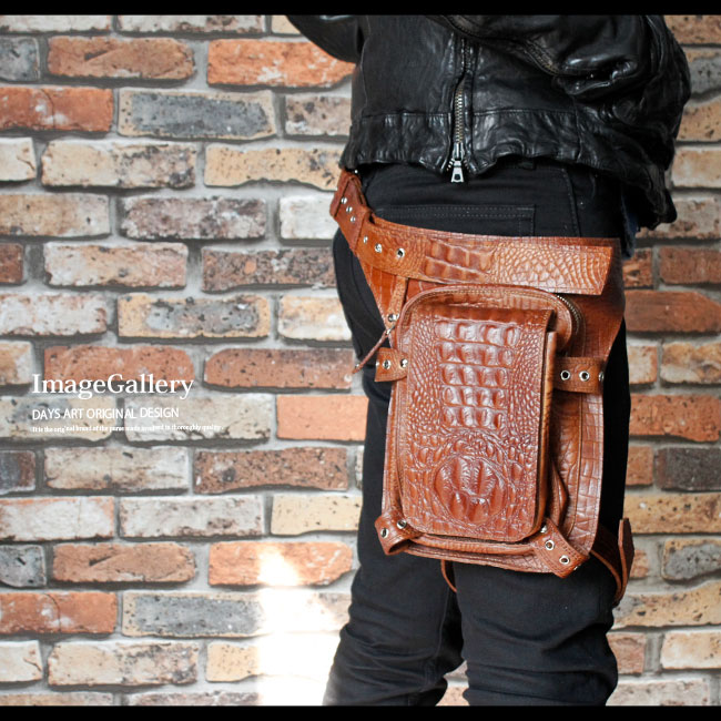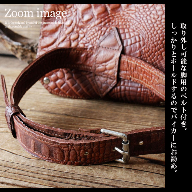 柔らかくキメの細かい上質なカーフスキンにリアルなクロコダイルの型押しを施し、ハンドメイドで製作したレザーウエストバッグです。前面ポケットにはクラウン部分がリアルに再現されています。長財布も収納可能な深さとマチのあるメインポケットがあり、使い勝手のいいマグネットボタンポケットや深さのあるファスナーポケットと十分な収納力があり、ウエストベルトとは別に取り外し可能な脚用のベルトでしっかり固定することができますので、バイクに乗るときなどしっかりとホールドしてくれます。バッグ本体からベルトに至るまで本革を使用しているため使い込むほどに馴染んでいき、自然と体にフィットしていきます。