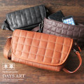 キメが細かく柔らかいカーフスキンを使用してハンドメイドで製作したショルダーバッグです。メインポケットと背面にポケットがあり、用途に分けて収納することができます。ブロック状のキルティング加工がシンプルなデザインにアクセントとなっていてお洒落です。