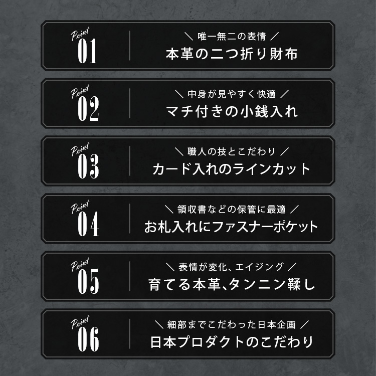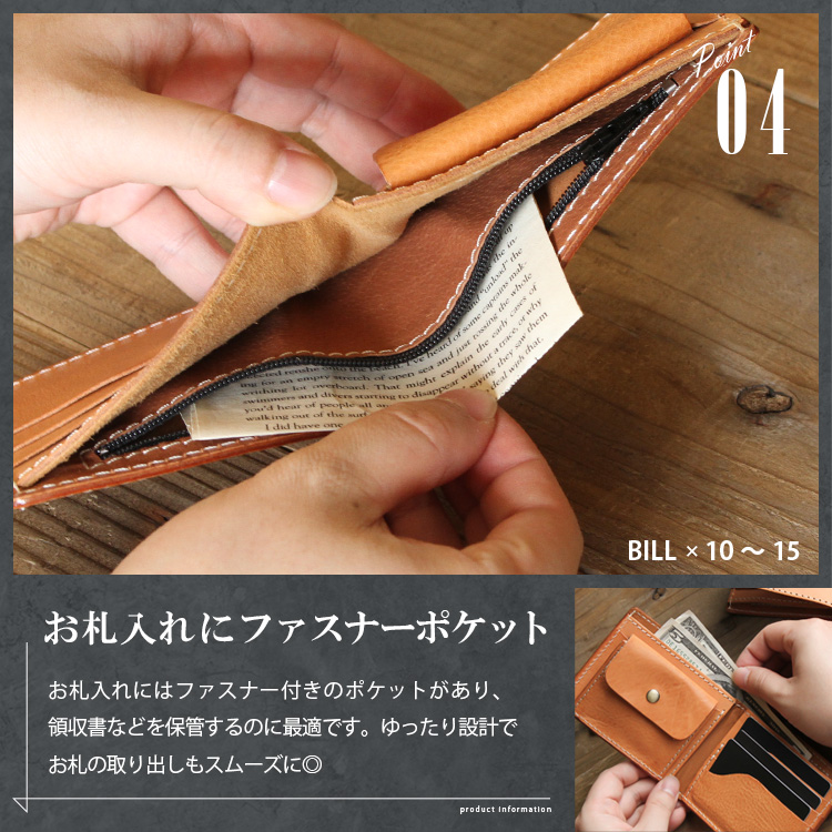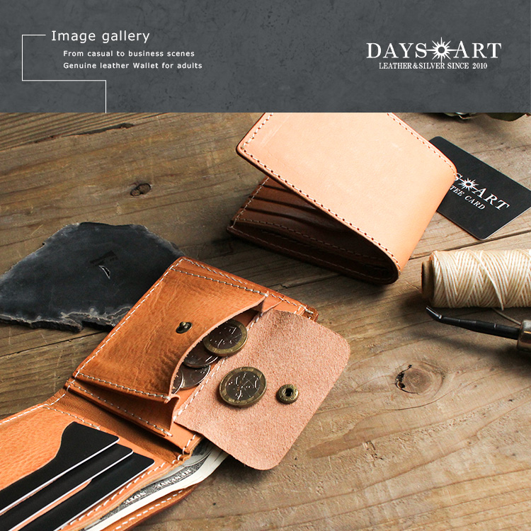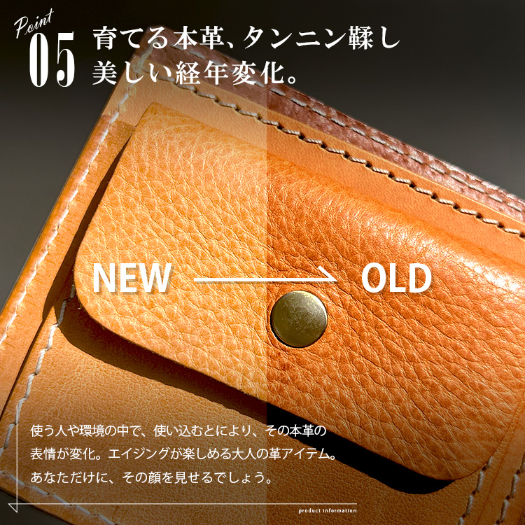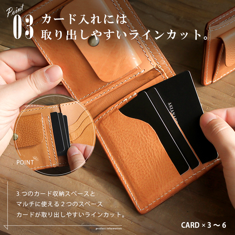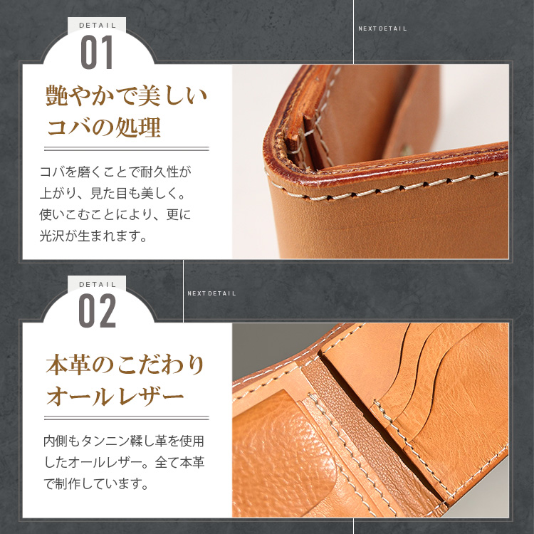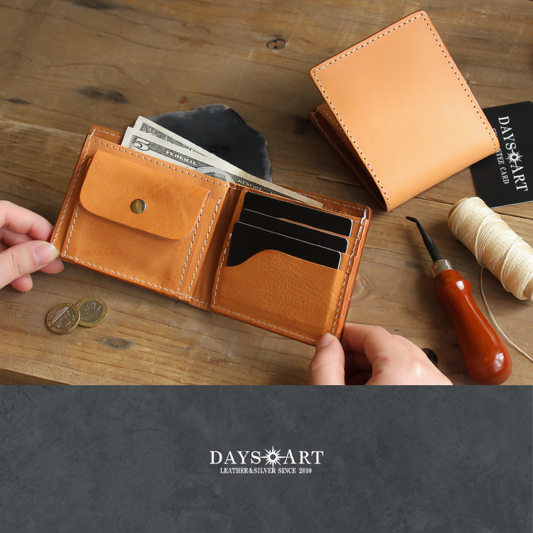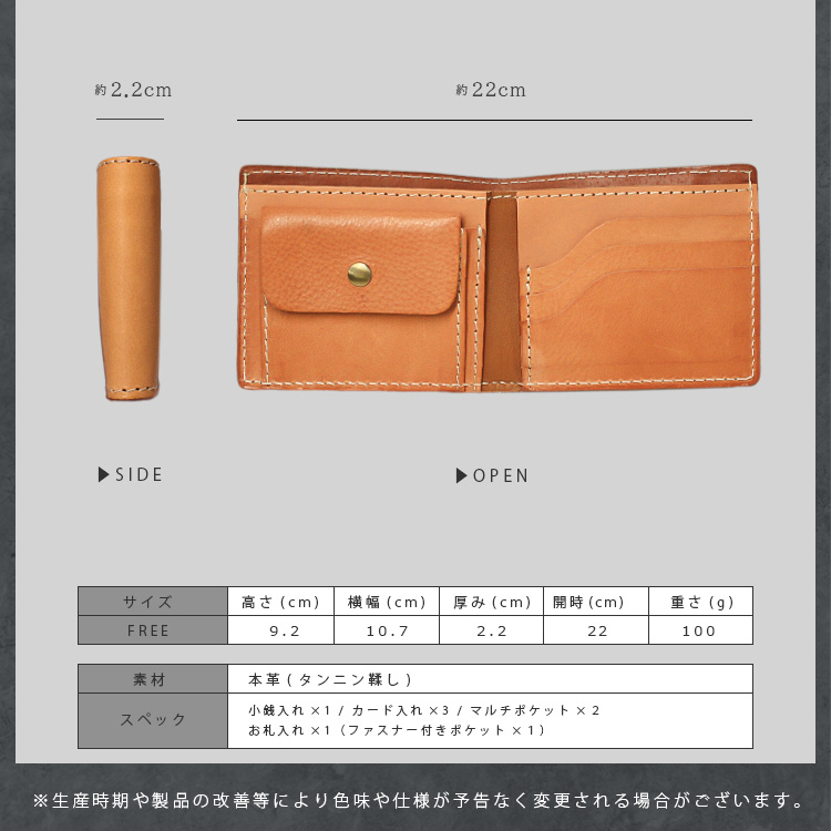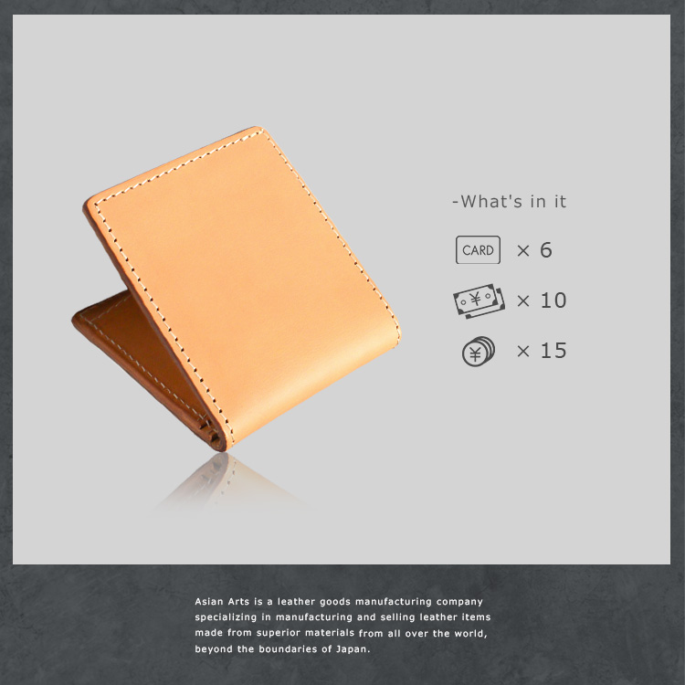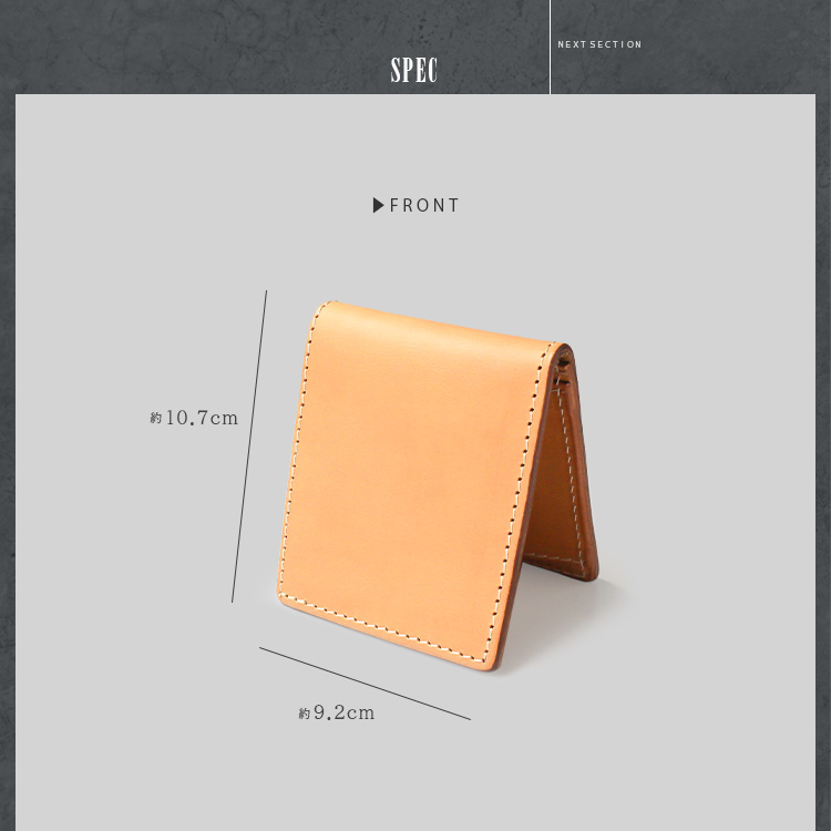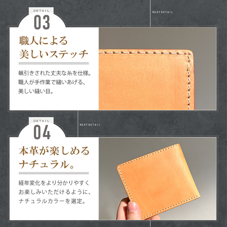 ベジタブルタンニン鞣しのイタリアンレザーを使用して職人が裁断から縫製まで手作業で仕上げた2つ折り財布です。ナチュラルな革のヌメ革を使用しており、牛革ならではの質感と飴色に変化していくエイジングが楽しめます。ポケットに収まるコンパクトなサイズで持ち運びがし易く、必要最低限の収納になっています。