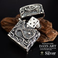 すべてが純銀製のライターケースは圧倒的な輝きで存在感があります。全体に唐草模様が施され、表裏に神秘的で力強い竜が描かれています。場所によっては厚み4mmを超える贅沢な作りは、持てばずっしりとくる重厚感を与えます。四方すべてに施されているハイクオリティなデザインは圧巻の一言。アーマータイプで重量感もあり今までにない圧倒的存在感を発揮します!